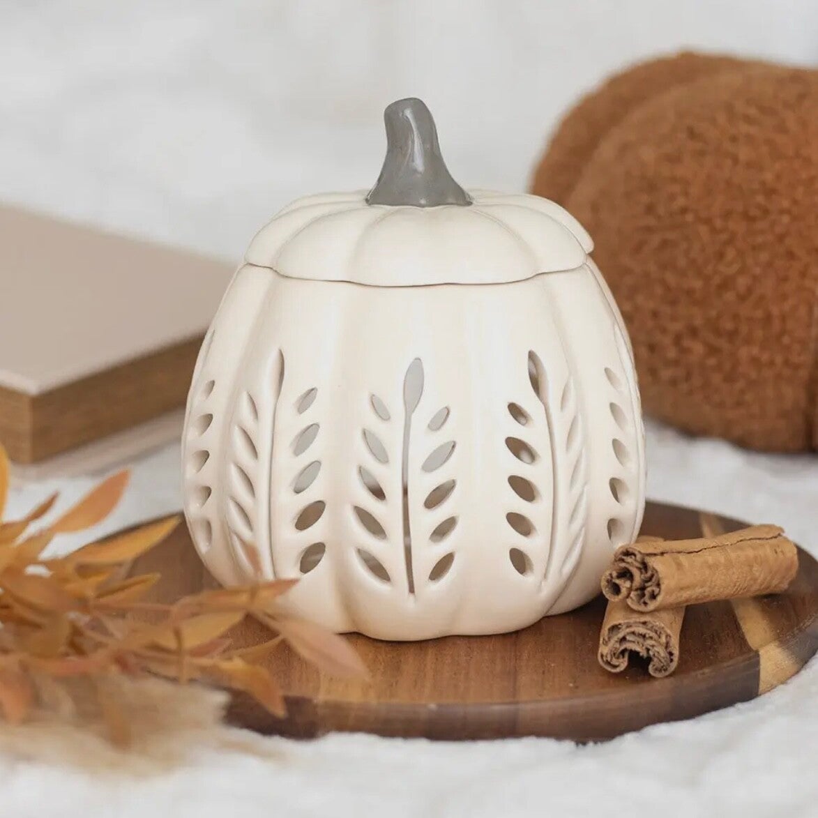 Fügen Sie Ihrem Zuhause einen Hauch von herbstlicher Eleganz hinzu mit diesem cremefarbenen, kürbisförmigen Olbrenner und Wachswärmer, der mit Ausschnitten versehen ist, um an kühlen Abenden eine gemütliche Atmosphäre zu schaffen. Ein perfekter Brenner zum Schmelzen von herbstlich inspirierten Wachsschmelzen oder Duftölen, der das Zuhause mit den beruhigenden Düften der Saison erfüllt.